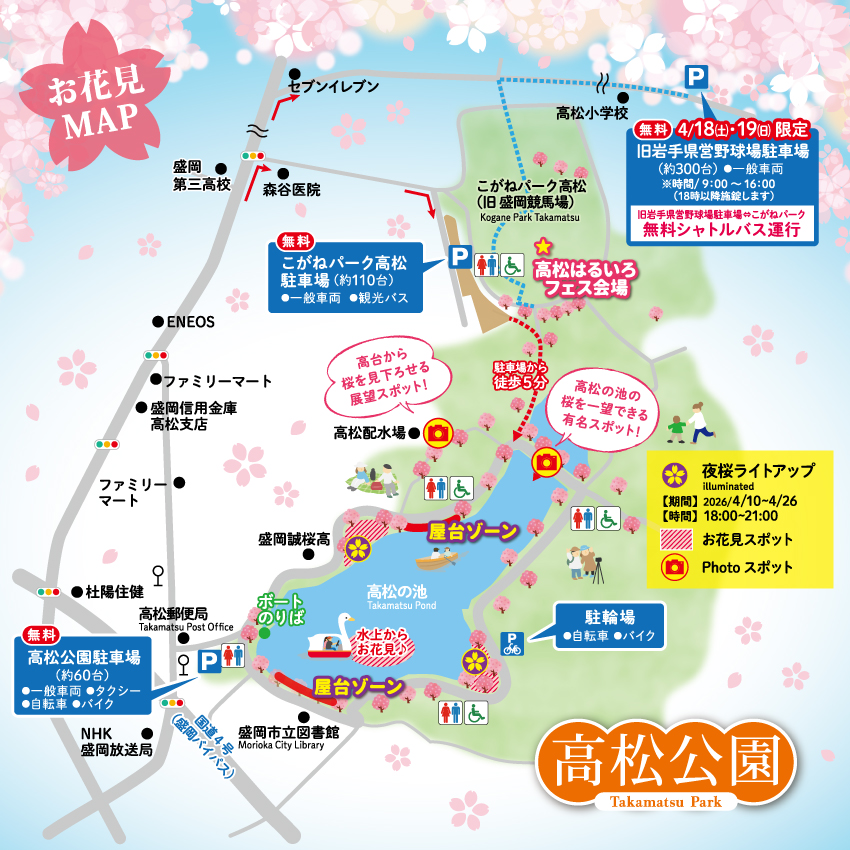 高松公園は、盛岡市の北部に位置する自然豊かな公園で、市民の憩いの場として親しまれています。公園の中心には「高松の池」があり、春には約1,200本の桜が咲き誇る絶景スポットとして知られています。桜の季節には「日本さくら名所100選」にも選ばれた美しい景観を、夏は水辺の涼しさを、秋は美しい紅葉を、冬は白鳥の飛来と幻想的な雪景色が楽しめます。
