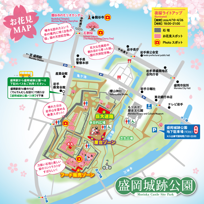 盛岡城跡公園は、かつて盛岡藩の居城「盛岡城」があった場所で、現在はお城の建物は残っていませんが立派な石垣や広々とした敷地で四季折々の自然が楽しめる市民憩いの場となっています。4月中旬には、園内の桜が一斉に咲き誇り、「盛岡さくらまつり」のメイン会場の一つとして多くの人がお花見に訪れます。特に、夜のライトアップされた桜と石垣のコントラストは幻想的で、人気のスポットです。